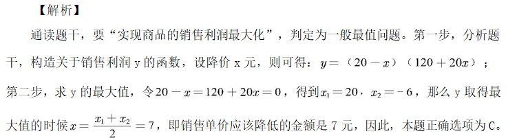 【例 1】某商品的进货单价为 80 元,销售单价为 100 元,每天可售出 120 件。已知销售单价每降低 1 元,每天可多售出 20 件。若要实现该商品的销售利润最大化,则销售单价应降低的金额是: